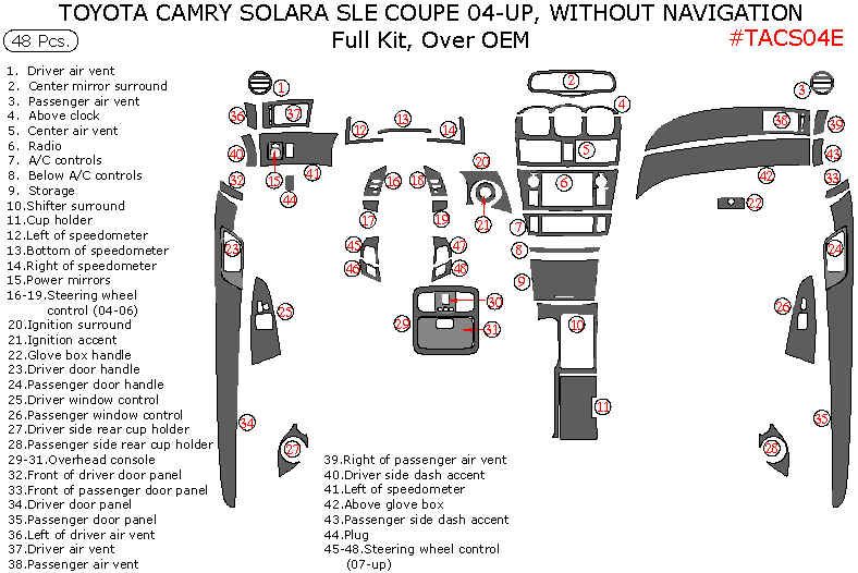 Toyota Camry Solara 2004, 2005, 2006, 2007, 2008, SLE, Coupe, Full Interior Kit, Over OEM, Without Navigation System, 48 Pcs.