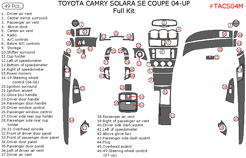 We offer a wide variety of colors and materials of Toyota Camry Solara 2004, 2005, 2006, 2007, 2008, SE, Coupe, Full Interior Kit, 49 Pcs. Choose your favourite option and place an order.