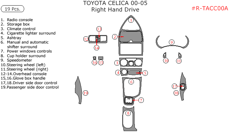 We offer a wide variety of colors and materials of Toyota Celica 2000, 2001, 2002, 2003, 2004, 2005, Interior Dash Kit, Right Hand Drive, 19 Pcs. Choose your favourite option and place an order.