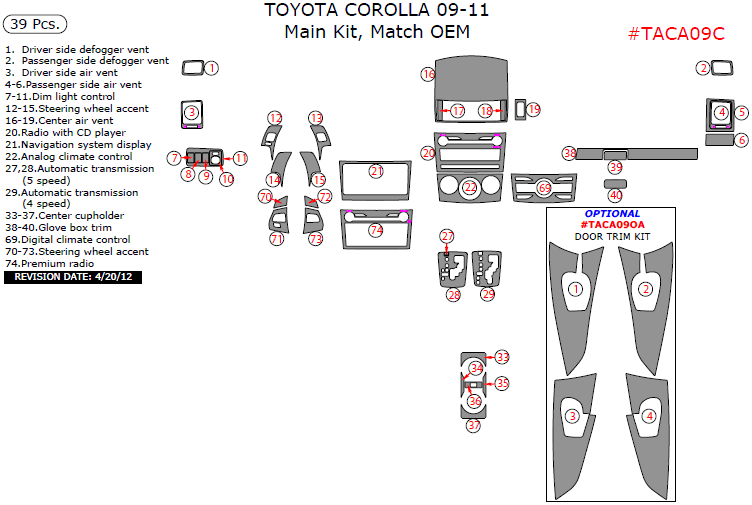 We offer a wide variety of colors and materials of Toyota Corolla 2009, 2010, 2011, Main Interior Kit, 39 Pcs., Match OEM. Choose your favourite option and place an order.