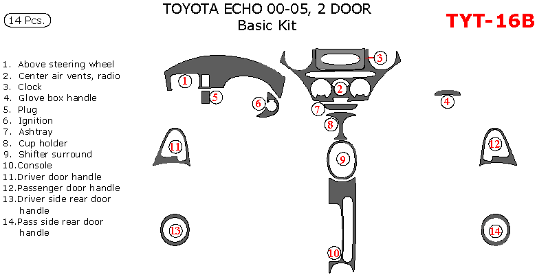 Toyota Echo 2000, 2001, 2002, 2003, 2004, 2005, Basic Interior Kit, 2 Door, 14 Pcs.