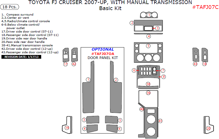 We offer a wide variety of colors and materials of Toyota FJ Cruiser 2007, 2008, 2009, 2010, 2011, 2012, 2013, 2014, Non-Match OEM, With Manual Transmission, Basic Interior Kit, 18 Pcs. Choose your favourite option and place an order.
