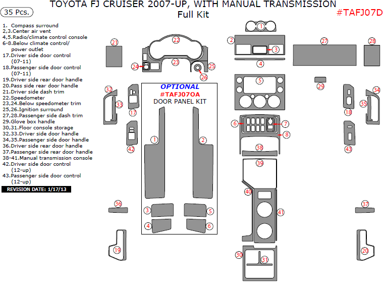 We offer a wide variety of colors and materials of Toyota FJ Cruiser 2007, 2008, 2009, 2010, 2011, 2012, 2013, 2014, Non-Match OEM, With Manual Transmission, Full Interior Kit, 35 Pcs. Choose your favourite option and place an order.