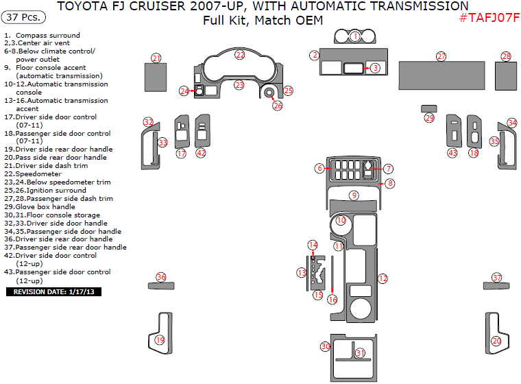 Toyota FJ Cruiser 2007, 2008, 2009, 2010, 2011, 2012, 2013, 2014, Match OEM, With Automatic Transmission, Full Interior Kit, 37 Pcs., Match OEM