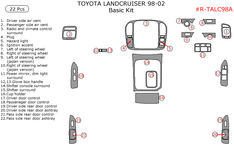Toyota Land Cruiser 1998, 1999, 2000, 2001, 2002, Right Hand Drive, Basic Interior Kit, 22 Pcs.