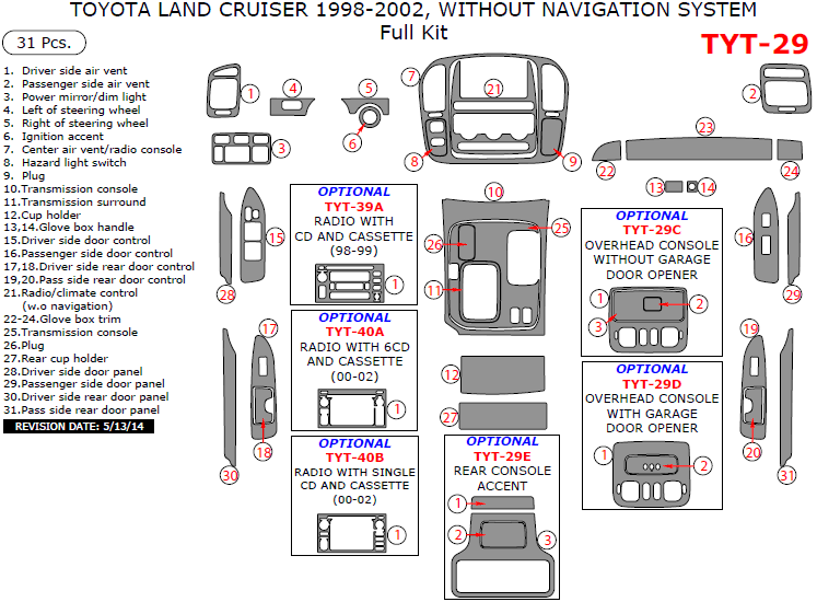 Toyota Land Cruiser 1998, 1999, 2000, 2001, 2002, Without Navigation System, Full Interior Kit, 31 Pcs.
