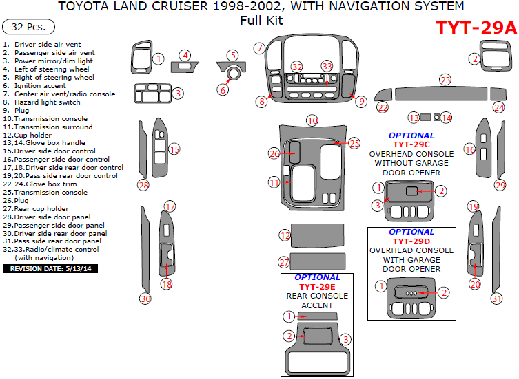 Toyota Land Cruiser 1998, 1999, 2000, 2001, 2002, With Navigation System, Full Interior Kit, 32 Pcs.