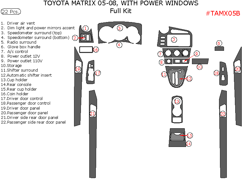 Toyota Matrix 2005, 2006, 2007, 2008, Full Interior Kit, With Power Windows, 22 Pcs.