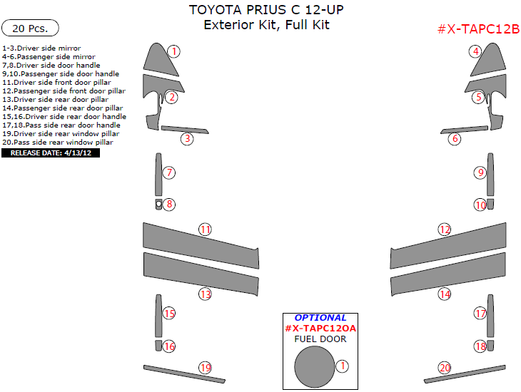Toyota Prius C 2012, 2013, 2014, Exterior Kit, Full Interior Kit, 20 Pcs.
