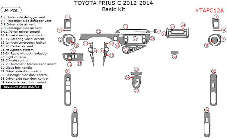 Toyota Prius C 2012, 2013, 2014, Basic Interior Kit, 34 Pcs.