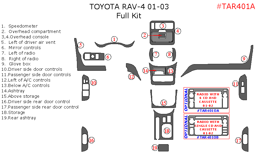 Toyota Rav4 2001, 2002, 2003, Full Interior Kit, 19 Pcs.
