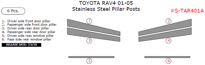 We offer a wide variety of colors and materials of Toyota Rav4 2001, 2002, 2003, 2004, 2005, Stainless Steel Pillar Posts, 6 Pcs. Choose your favourite option and place an order.