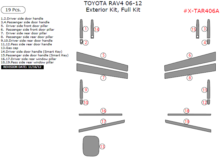 Toyota Rav4 2006, 2007, 2008, 2009, 2010, 2011, 2012, Exterior Kit, Full Interior Kit, 19 Pcs.