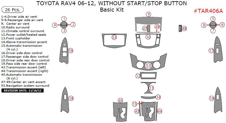 Toyota Rav4 2006, 2007, 2008, 2009, 2010, 2011, 2012, Without Start/Stop Button, Basic Interior Kit, 26 Pcs.
