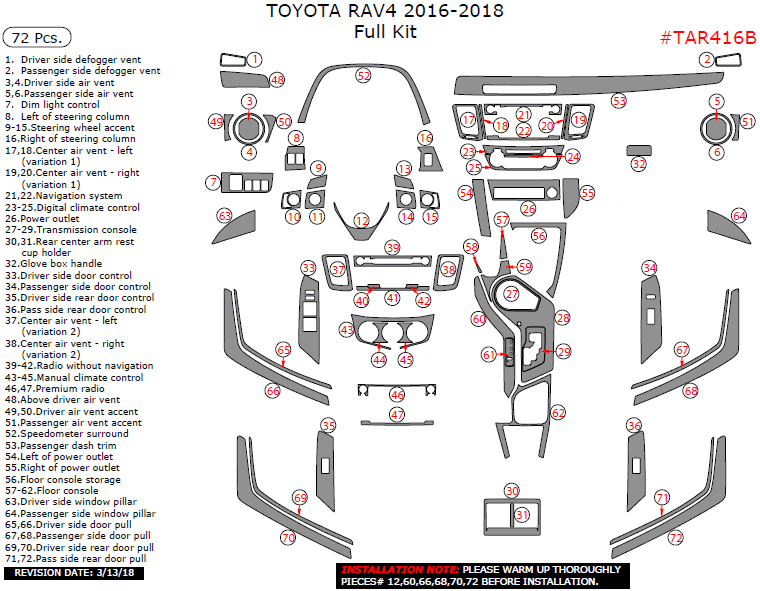 Toyota Rav4 2016, 2017, 2018, Full Interior Kit, 72 Pcs.