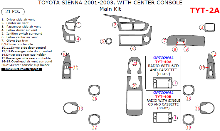 Toyota Sienna 2001, 2002, 2003, With Center Console Interior Kit, Main Interior Kit, 21 Pcs.