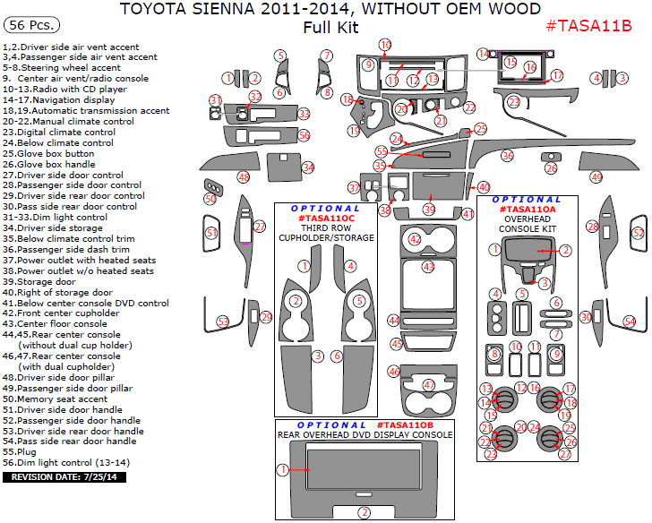 Toyota Sienna 2011, 2012, 2013, 2014, Without OEM Wood, Full Interior Kit, 56 Pcs.