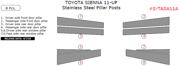 We offer a wide variety of colors and materials of Toyota Sienna 2011, 2012, 2013, 2014, 2015, 2016, 2017, Stainless Steel Pillar Posts, 8 Pcs. Choose your favourite option and place an order.