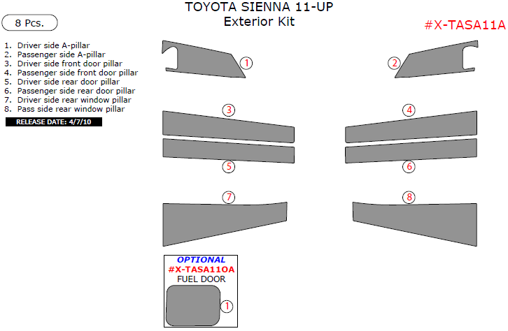 Toyota Sienna 2011, 2012, 2013, 2014, 2015, 2016, 2017, Exterior Kit, 8 Pcs.