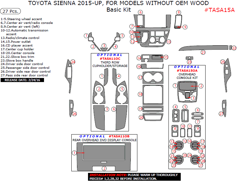 Toyota Sienna 2015, 2016, 2017, For Models Without OEM Wood, Basic Interior Kit, 27 Pcs.