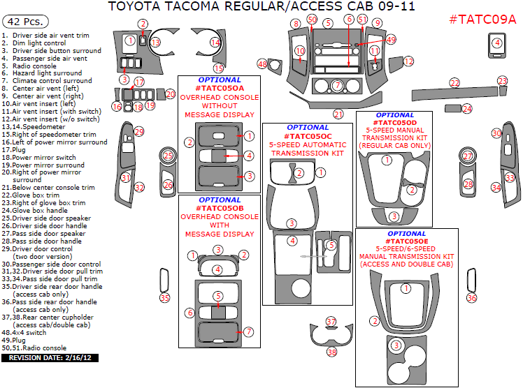We offer a wide variety of colors and materials of Toyota Tacoma 2009, 2010, 2011, Toyota Tacoma Interior Dash Kit, Regular/Access Cab 2009-2011, 42 Pcs. Choose your favourite option and place an order.