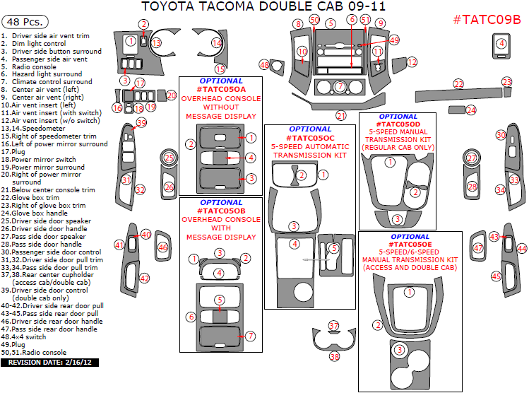 We offer a wide variety of colors and materials of Toyota Tacoma 2009, 2010, 2011, Toyota Tacoma Double Cab 2009-2011, Interior Dash Kit, 48 Pcs. Choose your favourite option and place an order.