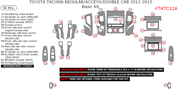 Toyota Tacoma 2012, 2013, 2014, 2015, Basic Interior Kit (Regular/Access/Double Cab), 36 Pcs.