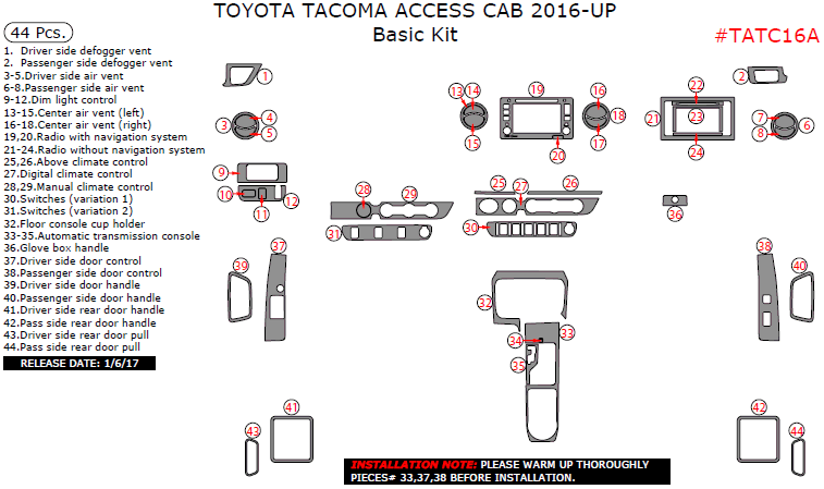 Toyota Tacoma Access Cab 2016, 2017, 2018, 2019, 2020, 2021, 2022, 2023, Basic Interior Kit, 44 Pcs.