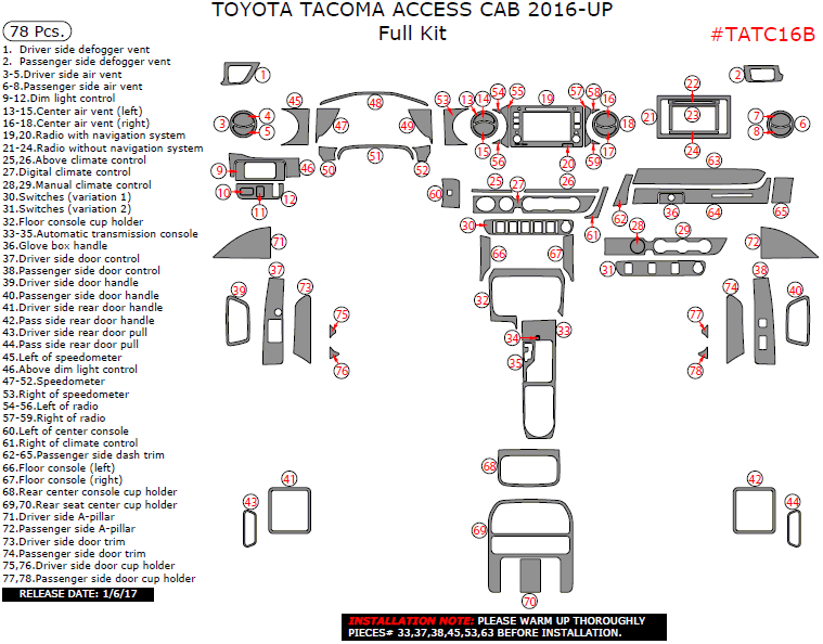 Toyota Tacoma Access Cab 2016, 2017, 2018, 2019, 2020, 2021, 2022, 2023, Full Interior Kit, 78 Pcs.