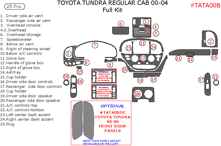 We offer a wide variety of colors and materials of Toyota Tundra 2000, 2001, 2002, 2003, 2004, Regular Cab, Full Interior Kit, 25 Pcs. Choose your favourite option and place an order.