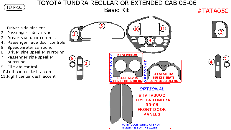 We offer a wide variety of colors and materials of Toyota Tundra 2005-2006, Regular & Extended Cab, Basic Interior Kit, 10 Pcs. Choose your favourite option and place an order.