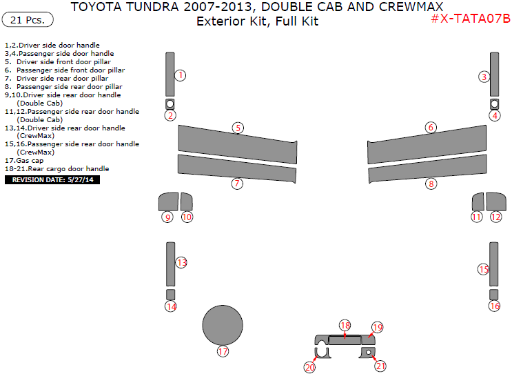 Toyota Tundra 2007, 2008, 2009, 2010, 2011, 2012, 2013, Exterior Kit, Double Cab And CrewMax, Full Interior Kit, 21 Pcs.