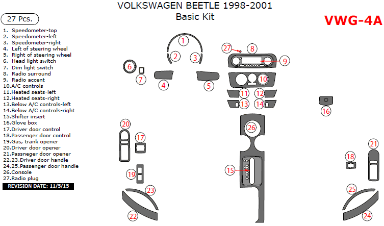 Volkswagen Beetle 1998, 1999, 2000, 2001, Basic Interior Kit, 27 Pcs.