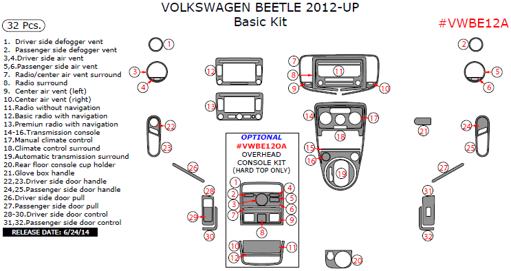 Volkswagen Beetle 2012, 2013, 2014, 2015, Basic Interior Kit, 32 Pcs.