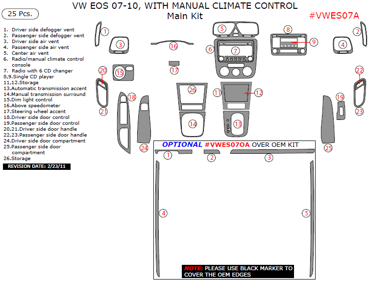 We offer a wide variety of colors and materials of Volkswagen Eos 2007, 2008, 2009, 2010, With Manual Climate Control, Main Interior Kit, 25 Pcs. Choose your favourite option and place an order.