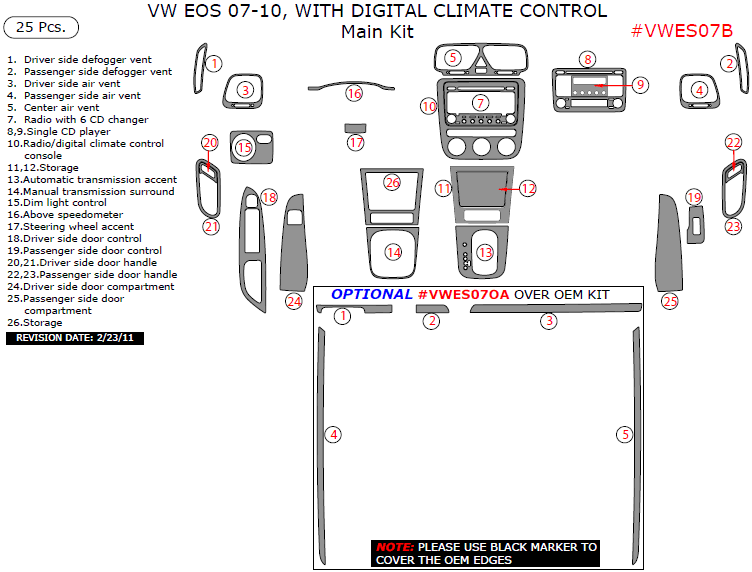 Volkswagen Eos 2007, 2008, 2009, 2010, With Digital Climate Control, Main Interior Kit, 25 Pcs.