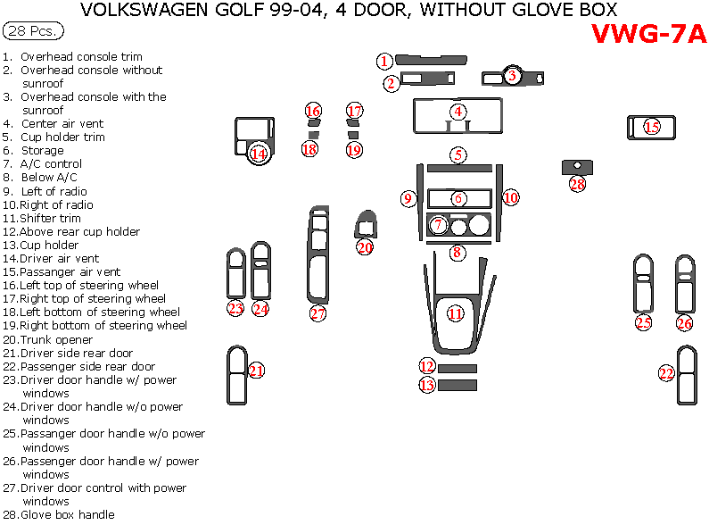 Volkswagen Golf 1999, 2000, 2001, 2002, 2003, 2004, Interior Dash Kit, 4 Door, Without Glove Box, 28 Pcs.
