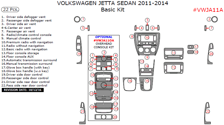 We offer a wide variety of colors and materials of Volkswagen Jetta Sedan 2011, 2012, 2013, 2014, Basic Interior Kit, 22 Pcs. Choose your favourite option and place an order.