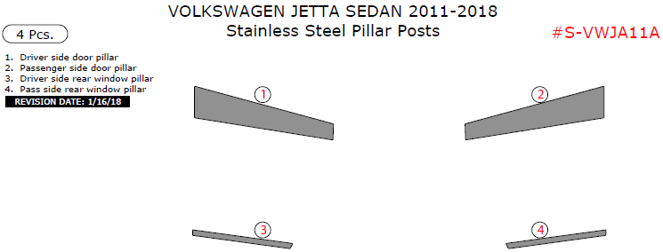 Volkswagen Jetta Sedan 2011, 2012, 2013, 2014, 2015, 2016, 2017, 2018 Stainless Steel Pillar Posts, 4 Pcs.