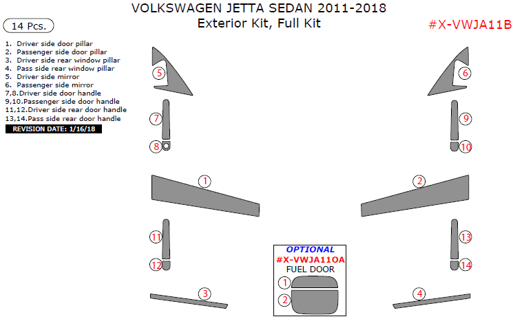 Volkswagen Jetta Sedan 2011, 2012, 2013, 2014, 2015, 2016, 2017, 2018 Exterior Kit, Full Interior Kit, 14 Pcs.