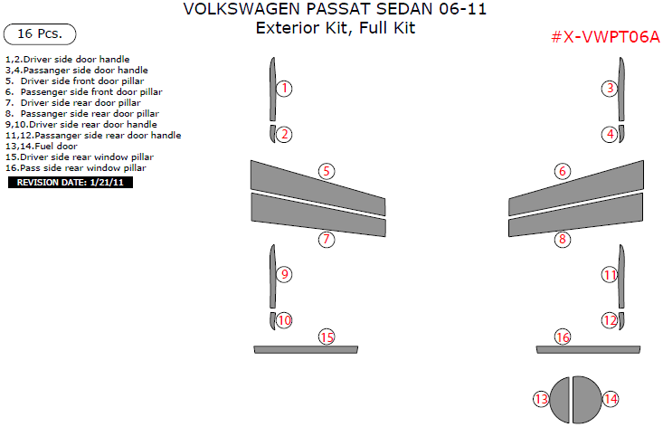 Volkswagen Passat 2006, 2007, 2008, 2009, 2010, 2011, Exterior Kit (Sedan Only), Full Interior Kit, 16 Pcs.