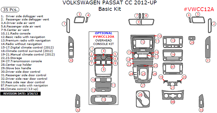 We offer basic interior dash kit of 35 pieces in a wide variety of colors and materials (carbon fiber, wood, etc.) for Volkswagen Passat CC 2012, 2013, 2014, 2015. Choose your favourite option of 2012-UP VW Passat CC interior accessory and place an order to buy the high-quality dash trim kit.