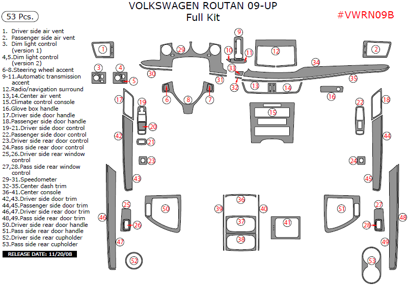 Volkswagen Routan 2009, 2010, 2011, 2012, 2013, 2014, 2015, Full Interior Kit, 53 Pcs.