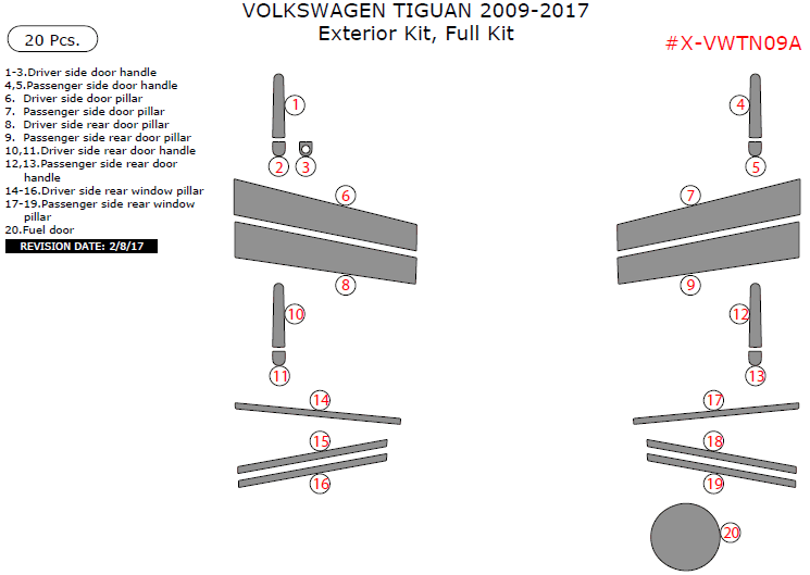 Volkswagen Tiguan 2009, 2010, 2011, 2012, 2013, 2014, 2015, 2016, 2017, Exterior Kit, Full Interior Kit, 20 Pcs.