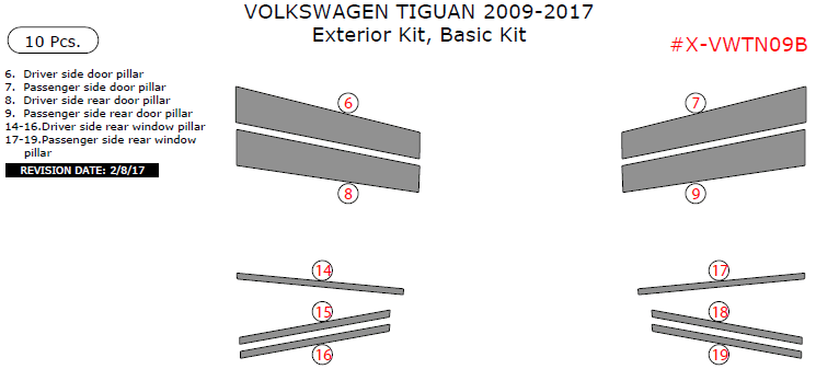 Volkswagen Tiguan 2009, 2010, 2011, 2012, 2013, 2014, 2015, 2016, 2017, Basic Exterior Kit, 10 Pcs.