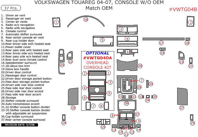 We offer a wide variety of colors and materials of Volkswagen Touareg 2004, 2005, 2006, 2007, Interior Dash Kit, W/o Console With OEM Wood, 37 Pcs. Choose your favourite option and place an order.