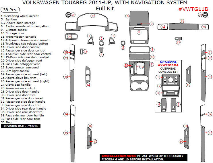 Volkswagen Touareg 2011, 2012, 2013, 2014, 2015, With Navigation System, Full Interior Kit, 38 Pcs.
