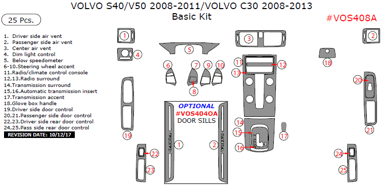 We offer a wide variety of colors and materials of Volvo S40/V50 2008, 2009, 2010, 2011/Volvo C30 2008, 2009, 2010, 2011, 2012, 2013, Basic Interior Kit, 25 Pcs. Choose your favourite option and place an order.