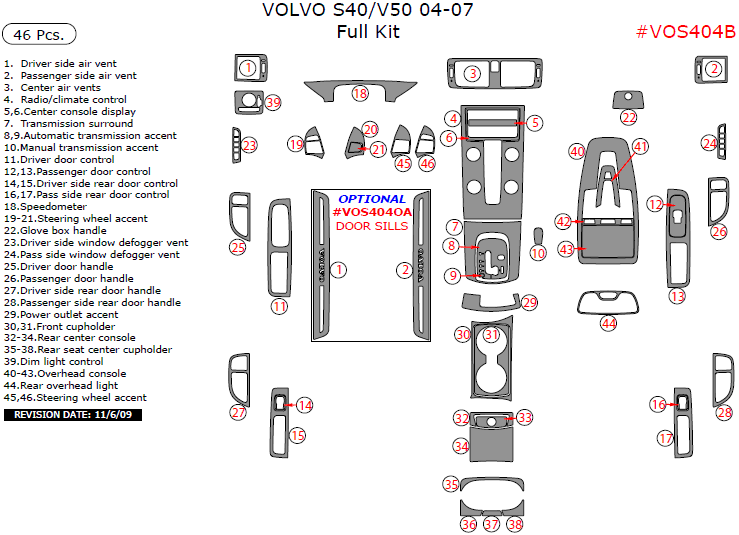 We offer a wide variety of colors and materials of Volvo S40/V50 2004, 2005, 2006, 2007, Full Interior Kit, 46 Pcs. Choose your favourite option and place an order.