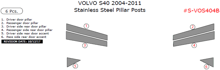 We offer a wide variety of colors and materials of Volvo S40 2004, 2005, 2006, 2007, 2008, 2009, 2010, 2011, Stainless Steel Pillar Posts, 6 Pcs. Choose your favourite option and place an order.